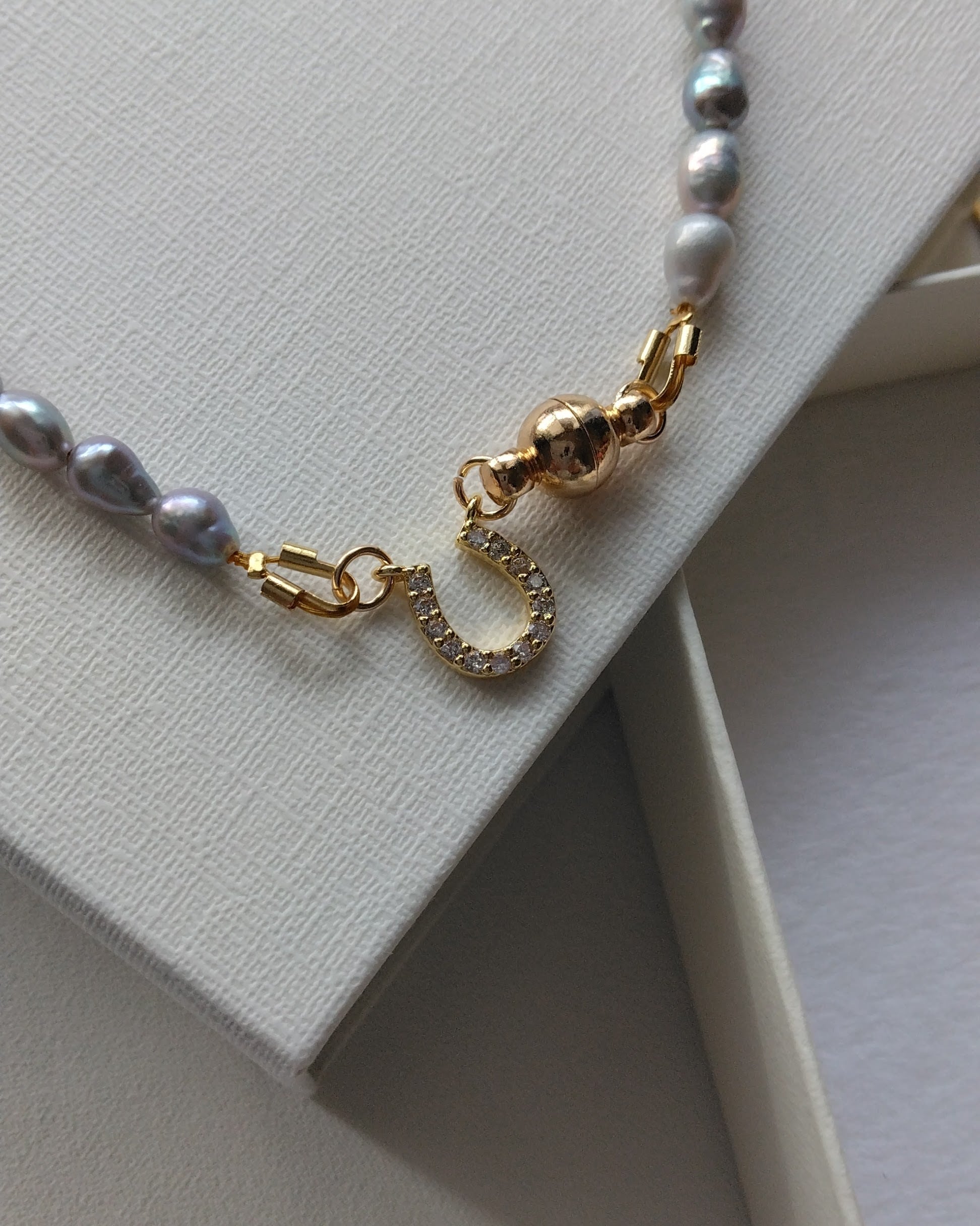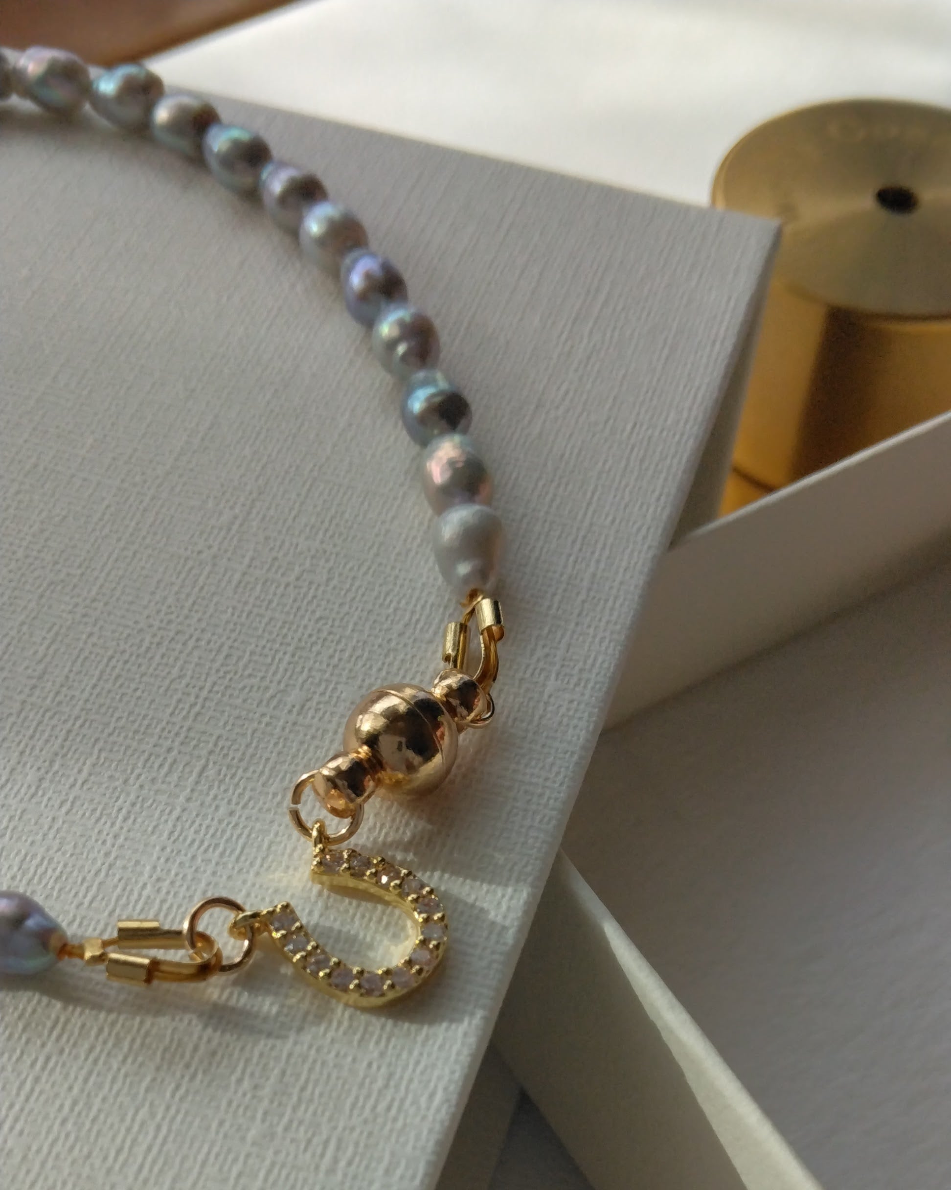 グレーのモードな輝きを馬蹄チャームとマグネットで機能性を高めたお品です。