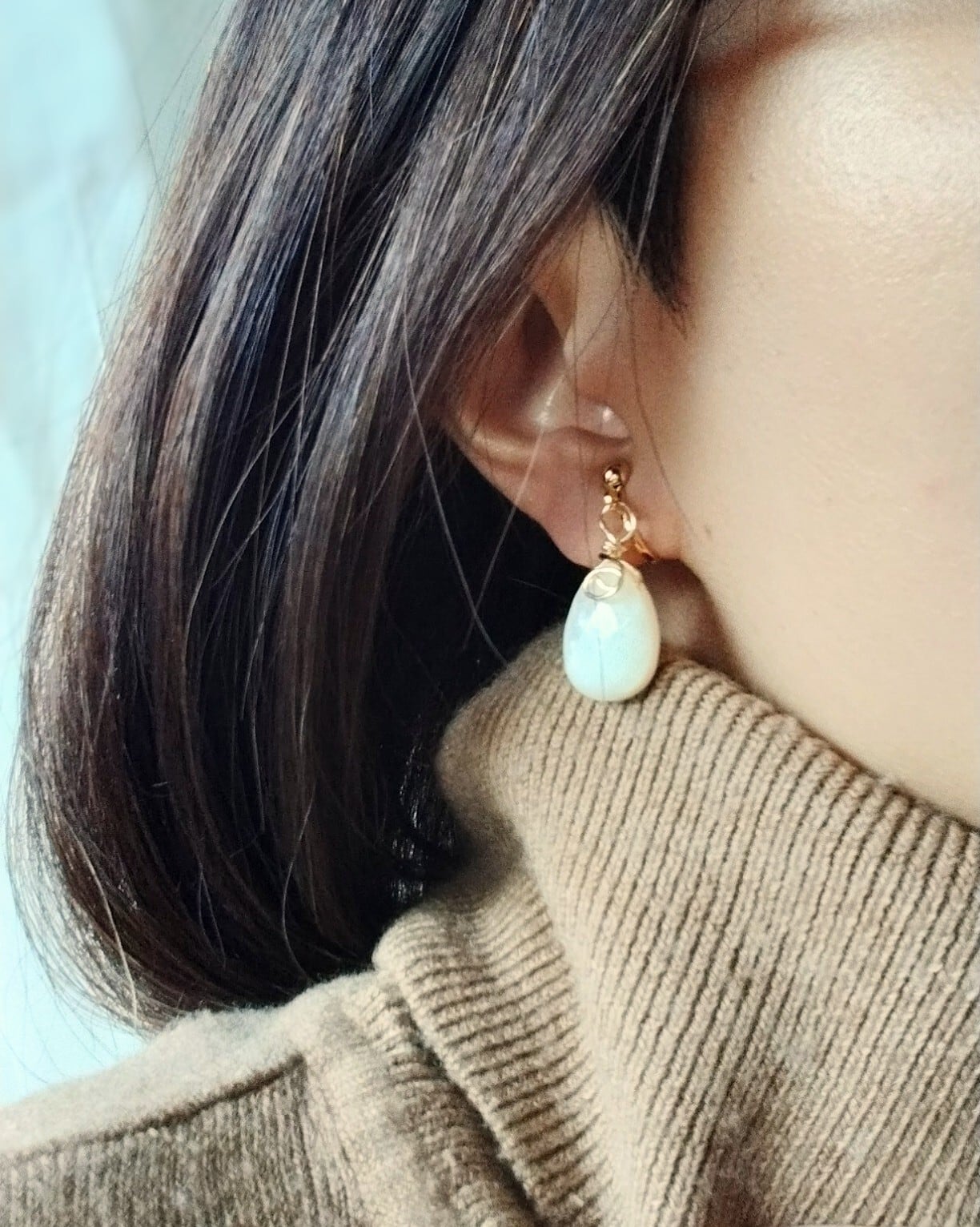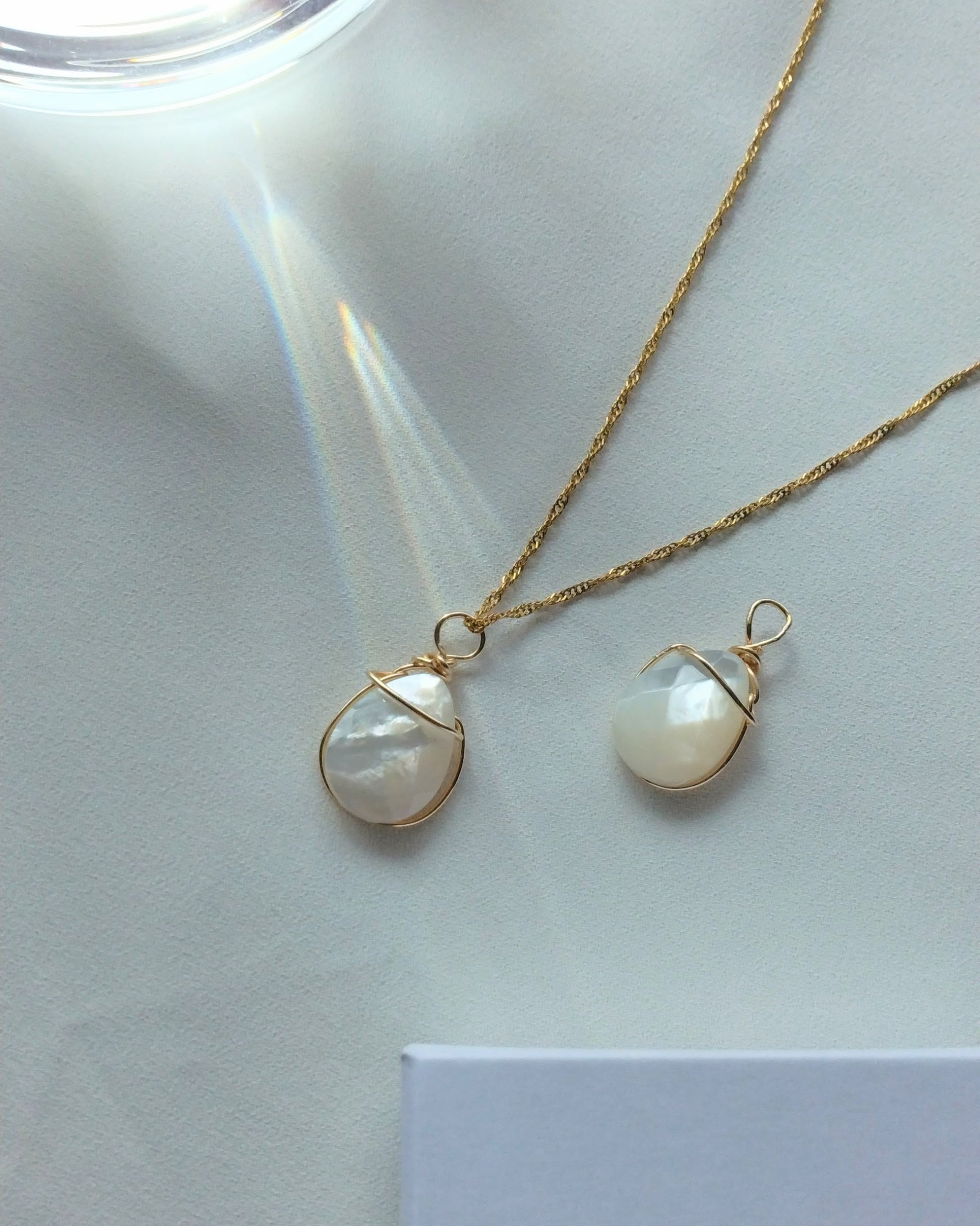 ドロップシェイプのマザーオブパールをニットの上にひとつ、ナイトドレスにひとつ。