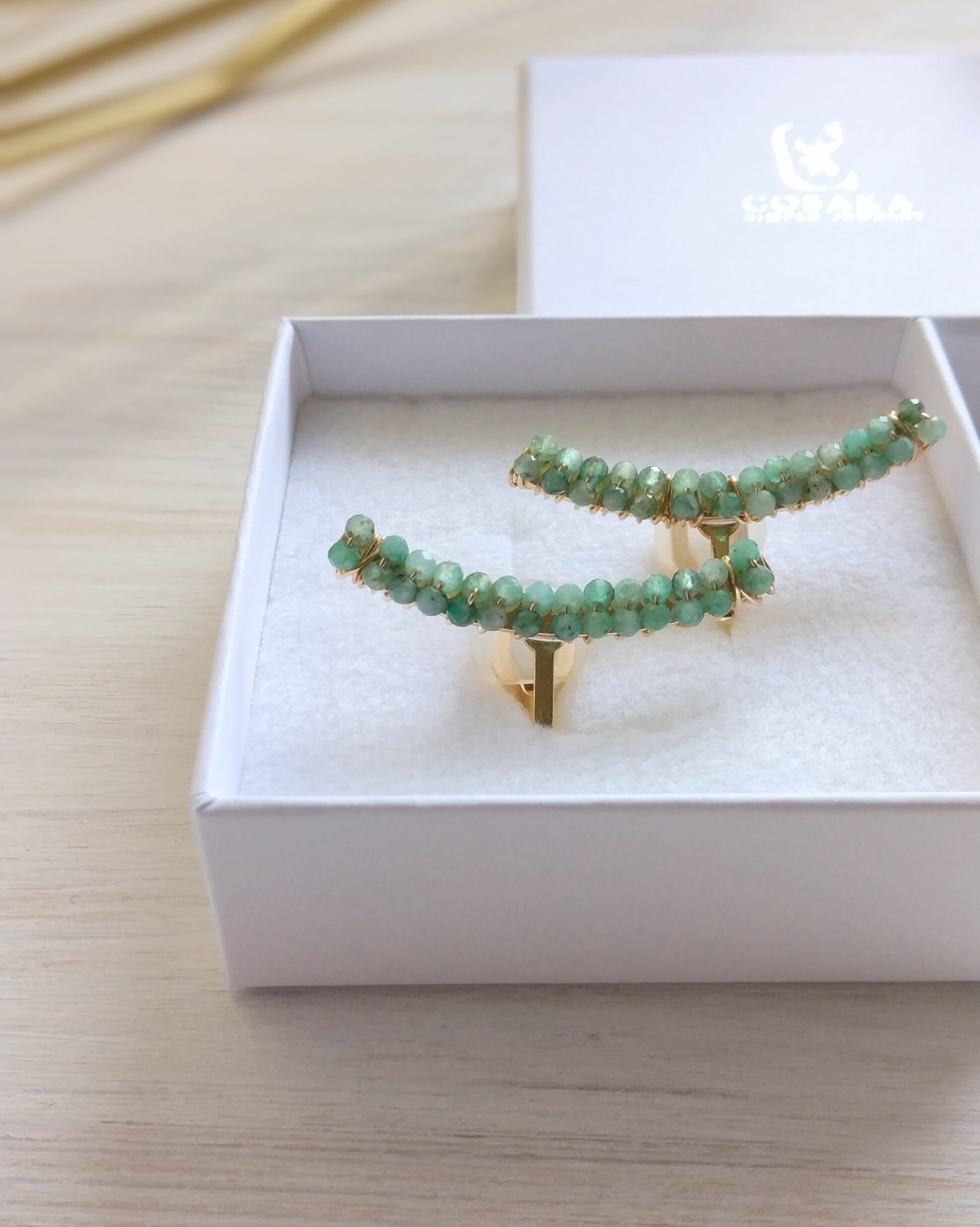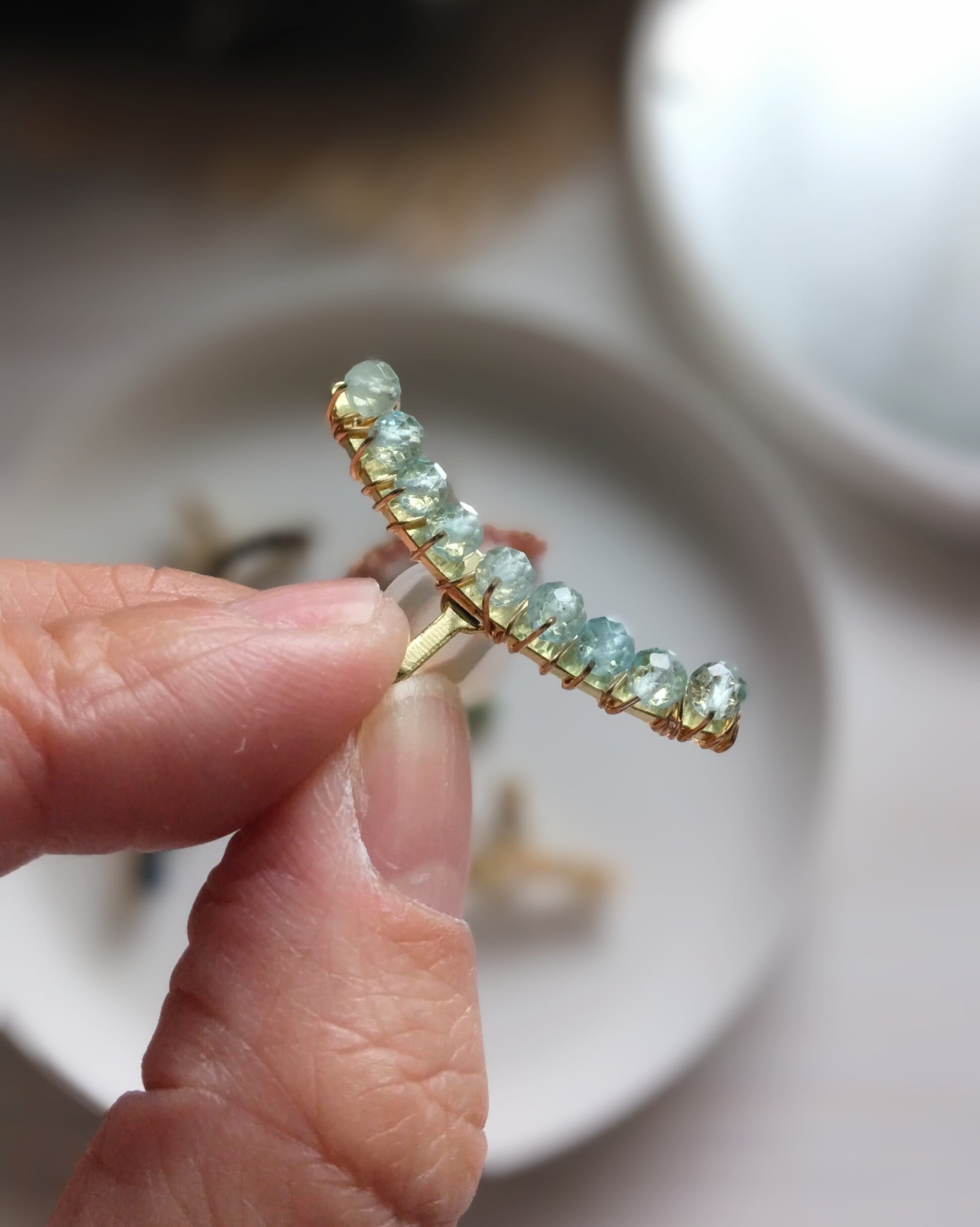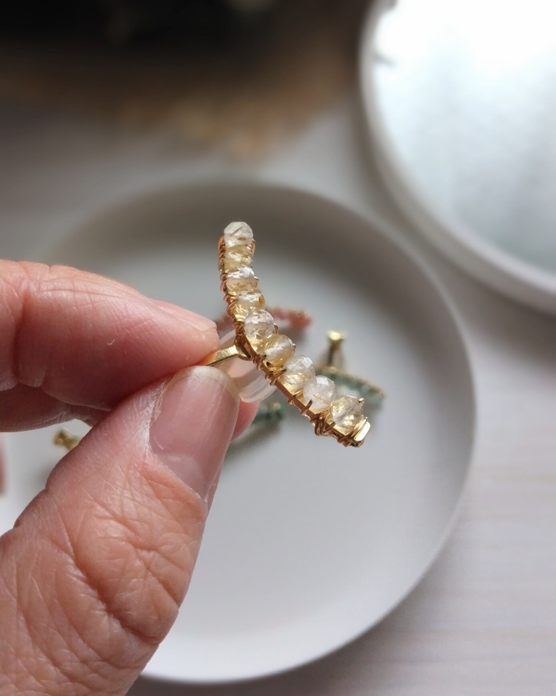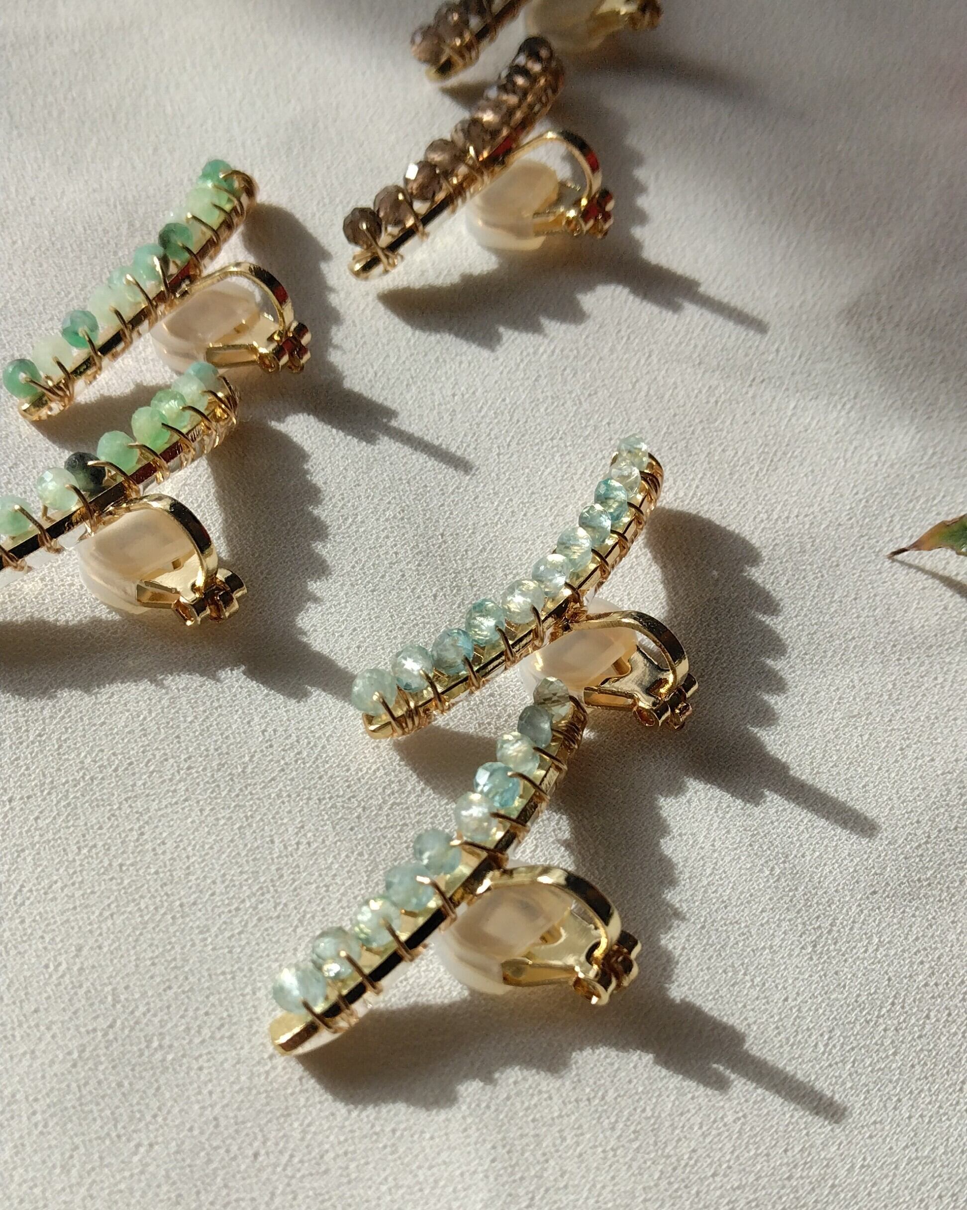 宝石質の粒にこだわり、ひとつひとつていねいにワイヤーで巻き付けています。
